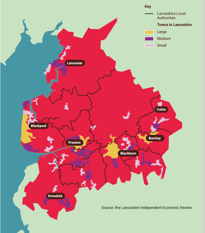 Size and location of towns in Lancashire